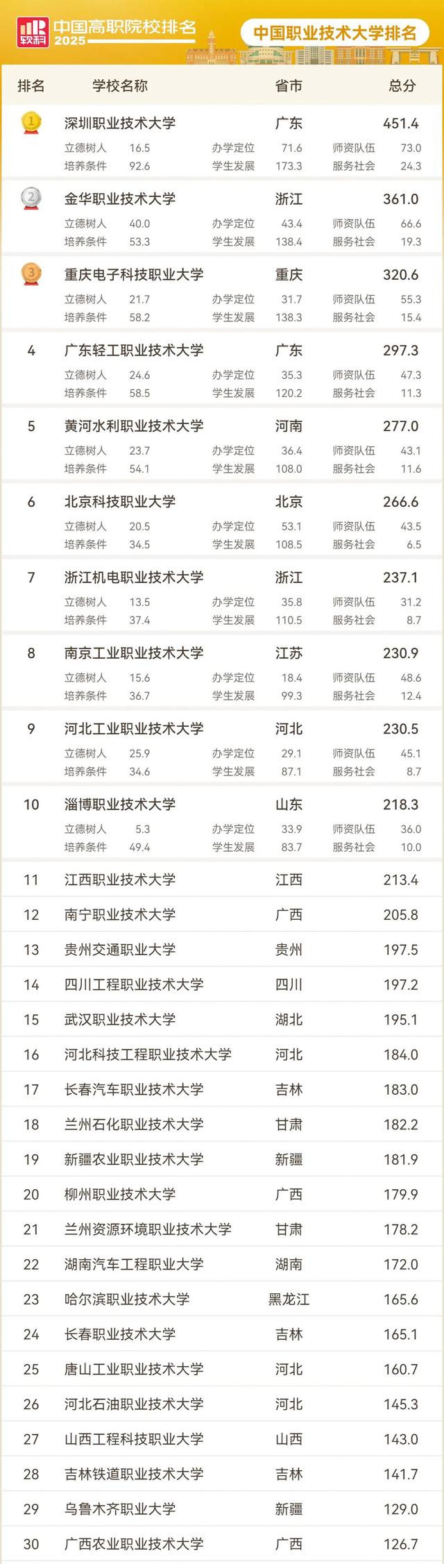 这些是软科(社会机构)排名中较为靠前的公办职业技术本科大学,其中深圳职业技术大学、金华职业技术大学、重庆电子科技职业技术大学位列前3,这些都是以前实力较强的高职院校,如今已升格为本科层次的职业技术大学。